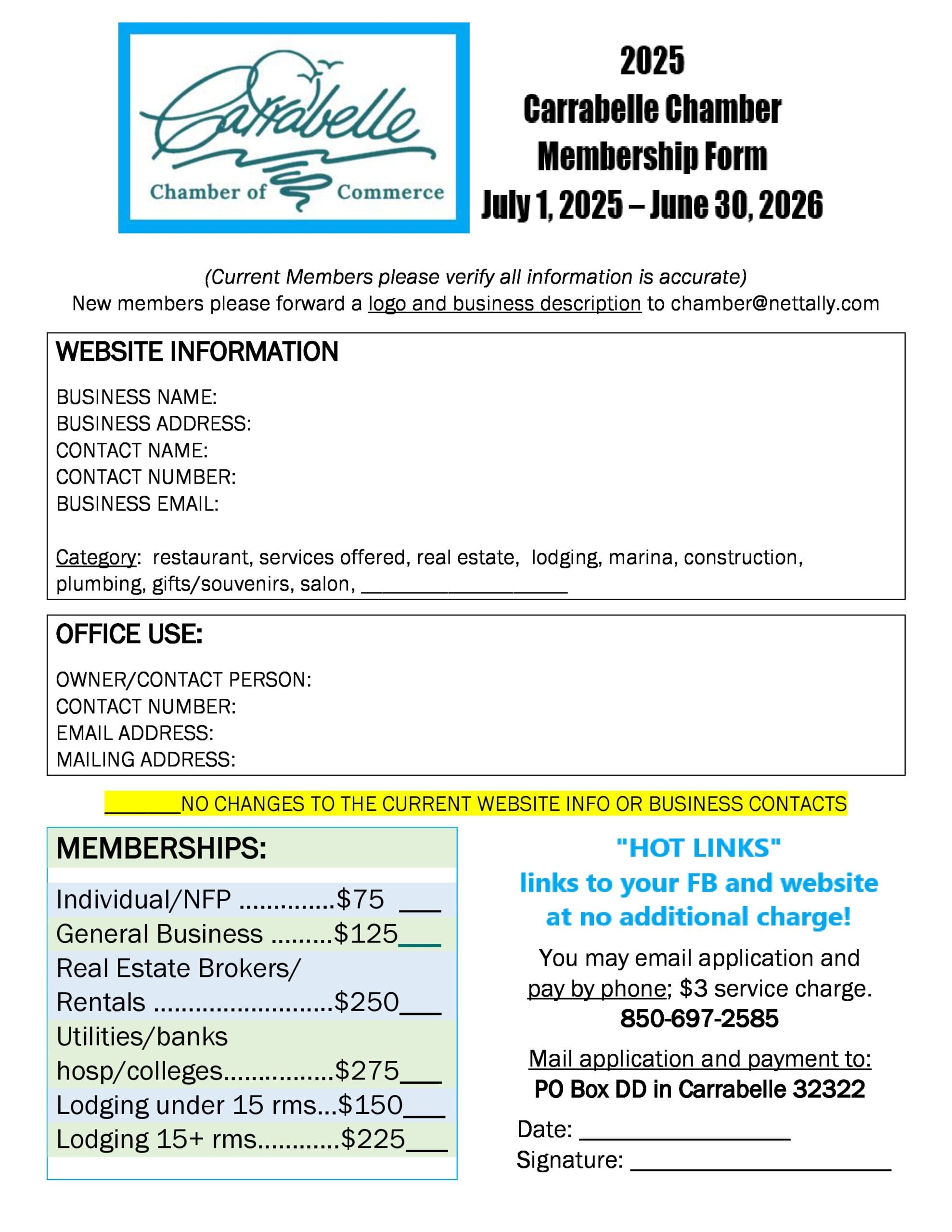 Can you afford NOT to belong to the Chamber? Join today! Call (850) 697-2585 with any questions pertaining to YOUR Membership options. Click here to get your 2025-2026 MEMBERSHIP APPLICATION (PDF) and 2025-2026 MEMBERSHIP APPLICATION (JPG).