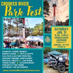 For Park Fest, tower climbs – day and evening – will be a special price of $5 for ages 13 and up. Children 12 and under are free with an adult and must be at least 44 inches tall. Current members also climb free. Climbers are rewarded with amazing panoramic views from the tallest lighthouse on the Forgotten Coast. Guests can also enjoy free entry to the Keeper’s House Museum to explore several exhibits and to view the original 4th Order Fresnel Lens, crafted in Paris in 1894. Climb tickets are available in the gift shop or online at https://www.crookedriverlighthouse.com/full-moon-events/.
