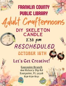 Rescheduled to October 16.  The Friends of the Franklin County Public Libraries (FFCPL) are pleased to announce a creative Halloween-themed craft event as part of their Fall Program Series – Adult Crafternoon: DIY Skeleton Candle. This hands-on crafting workshop will take place on Thursday, October 16, 2025, at 2:30 PM at the Eastpoint Branch Library, located at 160 Hickory Dip Road. The workshop is free with all materials supplied and open to all adults. No library card is required.