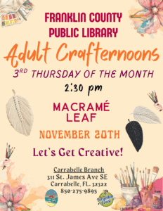 The Friends of the Franklin County Public Libraries (FFCPL) are pleased to announce a fun and creative event as part of their Fall Program Series – Adult Crafternoon: Macramé Leaf. This hands-on crafting workshop will take place on Thursday, November 20, 2025 at 2:30 PM at the Carrabelle Branch Library, located at 311 St. James Avenue (Hwy 98), Carrabelle, FL. The workshop is free with all materials supplied and open to all adults. No library card is required.