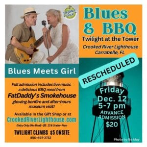 The Crooked River Lighthouse has rescheduled their special Blues & BBQ themed Twilight at the Tower to Friday, December 12 from 5:00-7:00 pm ET in Carrabelle, FL. This festive Blues & BBQ evening invites visitors to enjoy live music from the talented duo “Blues Meets Girl,” a glowing bonfire, and a delicious BBQ meal from FatDaddy’s Smokehouse, all set at the foot of Carrabelle’s lighthouse. Visitors can enjoy the natural surroundings as the golden sun sets and the long night unfolds.