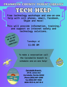 The Tech Help sessions will be held every Tuesday in September- September 2, 9, 16, 23, and 30 – at 11:00 am ET at the Carrabelle Branch Library, located at 311 St. James Ave. SE (Highway 98), Carrabelle, FL. These relaxed, judgment-free sessions provide one-on-one technology assistance for guests who need help with devices, email, digital resources, and basic tech skills. No registration is necessary—drop-ins are welcome!