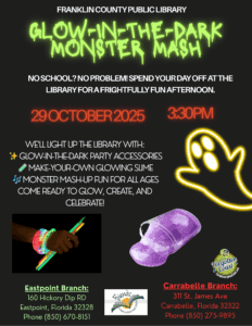 These programs are supported by the Friends of the Franklin County Public Libraries, a 501(c)(3) organization which supports the libraries in Eastpoint and Carrabelle. For details or to join the Friends, please visit https://friendsfcpl.com or contact the Carrabelle Branch at 311 St. James Ave SE (Hwy 98), 850-275-9895 or the Eastpoint Branch, at 160 Hickory Dip Rd, 850-670-8151. Funded in part by the Franklin County Tourist Development Council.