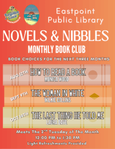 • Novels & Nibbles: Eastpoint Book Club will meet Tuesday, October 14 from 12–1:30 pm at the Eastpoint Branch to discuss The Last Thing He Told Me by Laura Dave. Light refreshments will be provided.