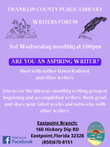 • Writer’s Forum will be held Wednesday, October 15 at 1 pm at the Eastpoint Branch for writers of all genres and skill levels.