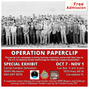 Camp Gordon Johnston WWII Museum in Carrabelle is presenting a special exhibit about Operation Paperclip. This exhibit will open on Tuesday, October 7 and be on display through Saturday, November 1.  The museum is open every Tuesday through Saturday from 11 am to 5 pm. There is no charge for admission, but donations are gladly accepted.
