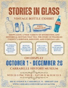 The Carrabelle History Museum is pleased to announce a special display featuring vintage bottles of the Forgotten Coast. This exhibit will be on display from Wednesday, October 1 through Sunday, December 28. This unique exhibit will showcase a wide variety of interesting and historical bottles that tell the story of Franklin County’s heritage, industry, and everyday life. Visitors can explore this special exhibit on Wednesdays from 12 to 5 pm ET, Thursdays through Saturdays from 10 am to 5 pm ET, and Sundays from 12 to 5 pm ET. Admission is free, with donations warmly welcomed.