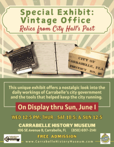 The Carrabelle History Museum is pleased to share a special display, “Vintage Office – Relics from City Hall’s Past”. This display is open now through Sunday, June 1. This unique exhibit offers a nostalgic look into the daily workings of Carrabelle’s city government and the tools that helped keep the city running. Visitors can explore the exhibit at the Carrabelle History Museum on Wednesdays from 12 to 5 pm ET, Thursdays through Saturdays from 10 am to 5 pm ET, and Sundays from 12 to 5 pm ET. Admission is free, with donations warmly welcomed.