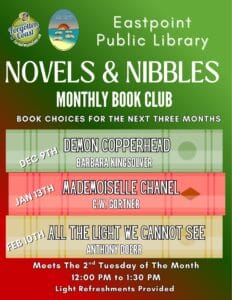 Novels & Nibbles: Book Club will meet on Tuesday, February 10 from 12–1:30 PM at the Eastpoint Branch to discuss the month’s selection, All the Light We Cannot See by Anthony Doerr. Light refreshments will be served.