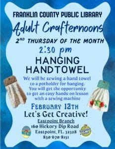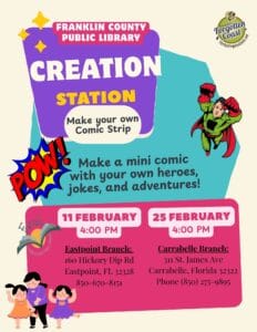 The Friends of the Franklin County Public Libraries (FFCPL) announces a week filled with creativity, connection, and community at the Eastpoint and Carrabelle Branches of the Franklin County Public Libraries through their popular Program Series. Library programs are free and open to the public with no library card required.