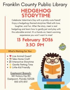 These programs are supported by the Friends of the Franklin County Public Libraries, a 501(c)(3) organization that supports the Eastpoint and Carrabelle branches. For more information or to join the Friends, please visit friendsfcpl.com or contact the Carrabelle Branch at 311 St. James Ave SE (Hwy 98), 850-275-9895, or the Eastpoint Branch at 160 Hickory Dip Rd, 850-670-8151. Programs are funded in part by the Franklin County Tourist Development Council.