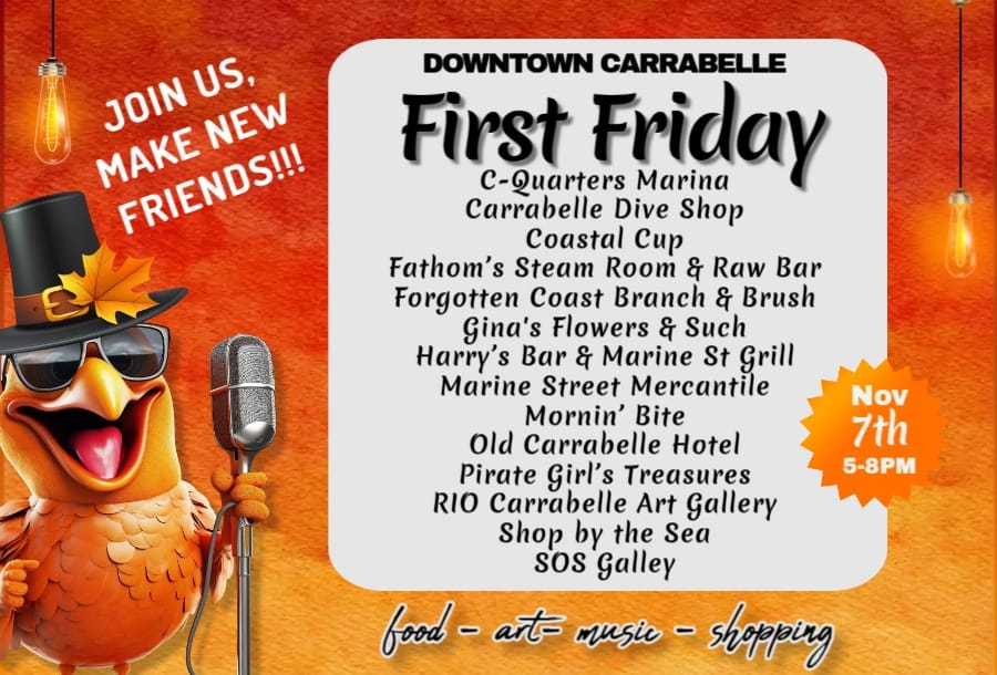 Give thanks for good friends, great food, and our wonderful community at the Downtown Carrabelle First Friday! Join us for an evening filled with autumn charm, live music, local shopping, and the warm spirit of the season. 🍁 What to Expect: • Live Music & Local Art: Enjoy the smooth sounds of the Rio Jazz… |